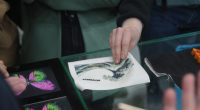 Gruppe schaut eine Ausstellung von Zahnmodellen an