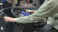 Mensch sitzt an einem Auto Hubmodell